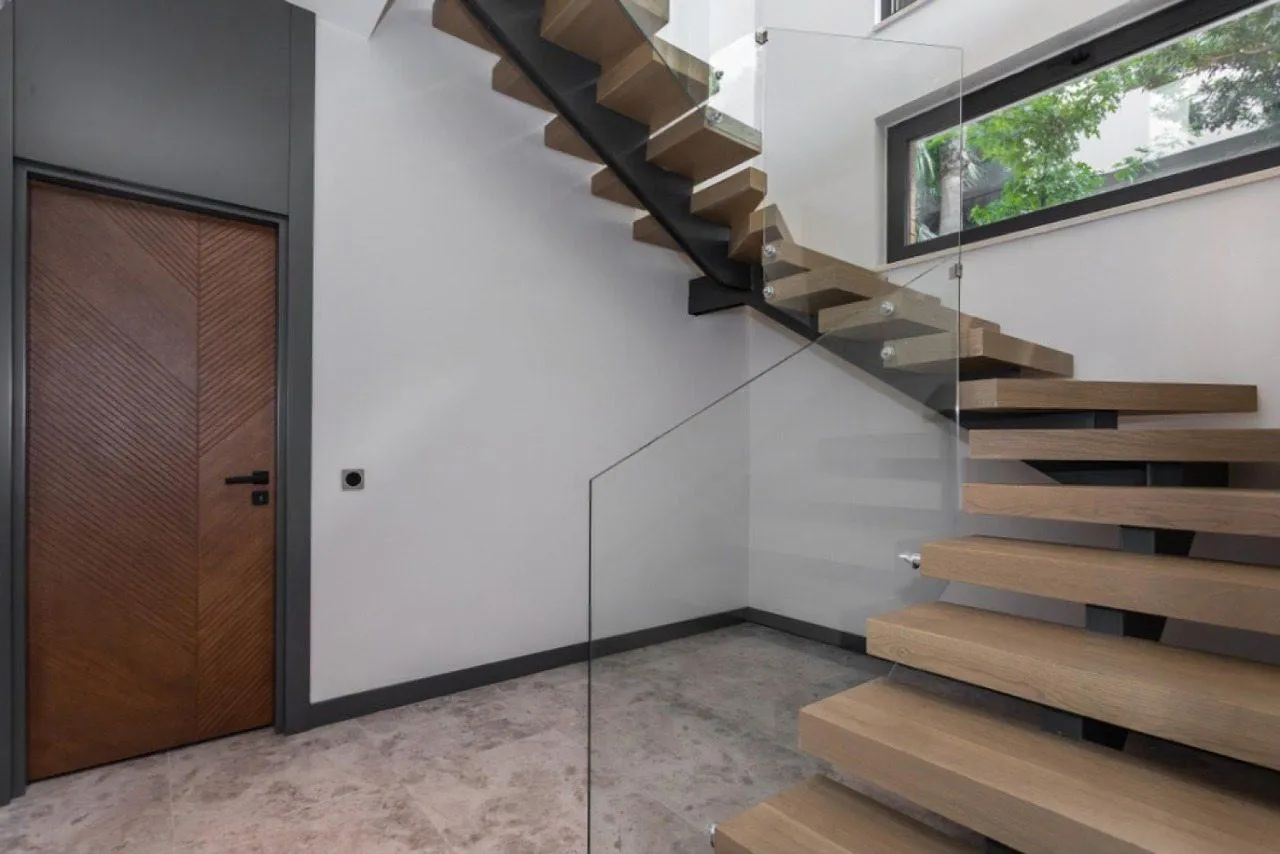 Визуальная легкость этой лестницы обманчива — это абсолютно надежная и безопасная конструкция. Монокосоур из толстостенного металла обеспечивает идеальную жесткость и исключает любые вибрации. Ограждения из закаленного стекла триплекс создают невидимый, но прочный барьер, гарантируя безопасность для всех членов семьи. Продуманный шаг и удобные забежные ступени делают каждый подъем и спуск максимально комфортным.